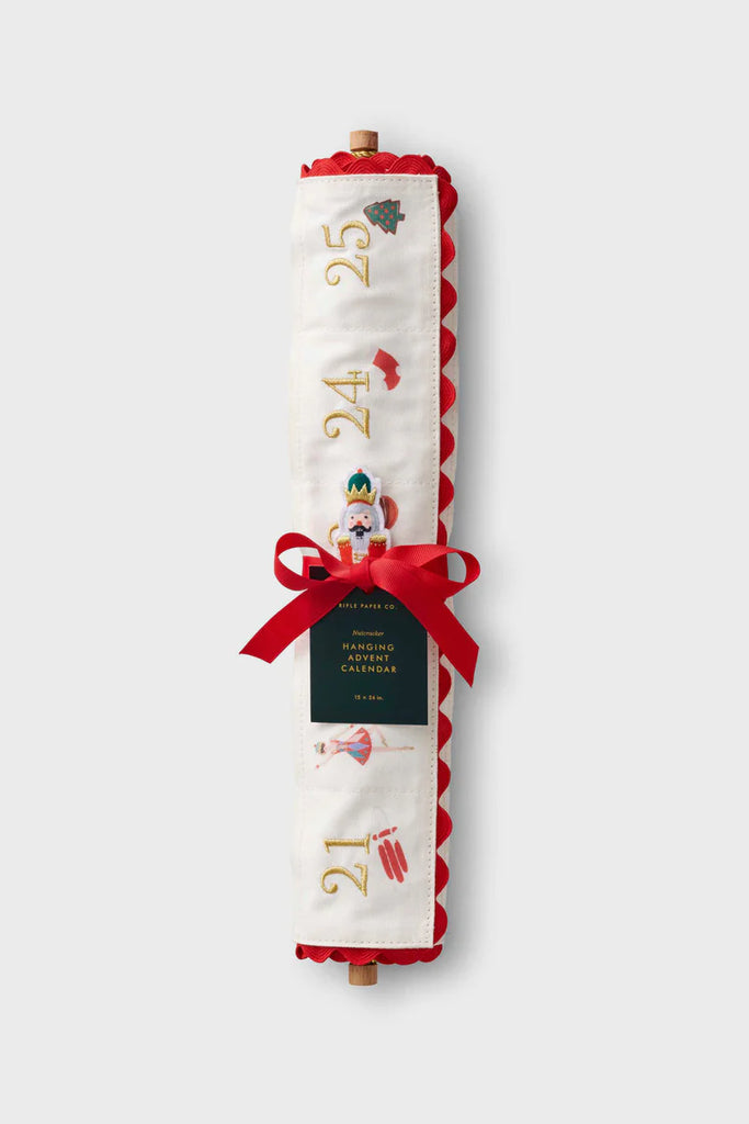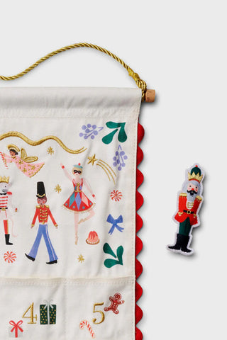 Countdown to Christmas with Rifle Paper Co.'s fabric advent calendar, with embroidered designs and a felt Nutcracker figurine to move from day to day. The calendar hangs from a dowel with a gold cord for display.