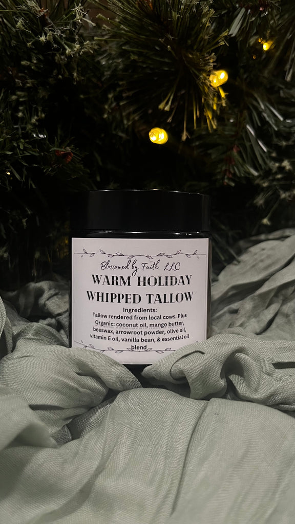 Ingredients: whipped tallow, organic olive oil, organic coconut oil, organic mango butter, organic arrowroot powder, and pure essential oil blends with a subtle warm holiday scent. A perfect gift for Christmas, or to yourself this time of year!