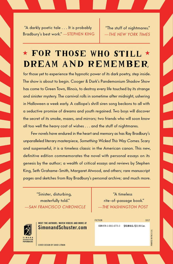 For those who still dream and remember, for those yet to experience the hypnotic power of its dark poetry, step inside. The show is about to begin. Cooger & Dark's Pandemonium Shadow Show has come to Green Town, Illinois, to destroy every life touched by its strange and sinister mystery. The carnival rolls in sometime after midnight, ushering in Halloween a week early. A calliope's shrill siren song beckons to all with a seductive promise of dreams and youth regained. Two boys will discover the secret of its smoke, mazes, and mirrors; two friends who will soon know all too well the heavy cost of wishes...and the stuff of nightmares.