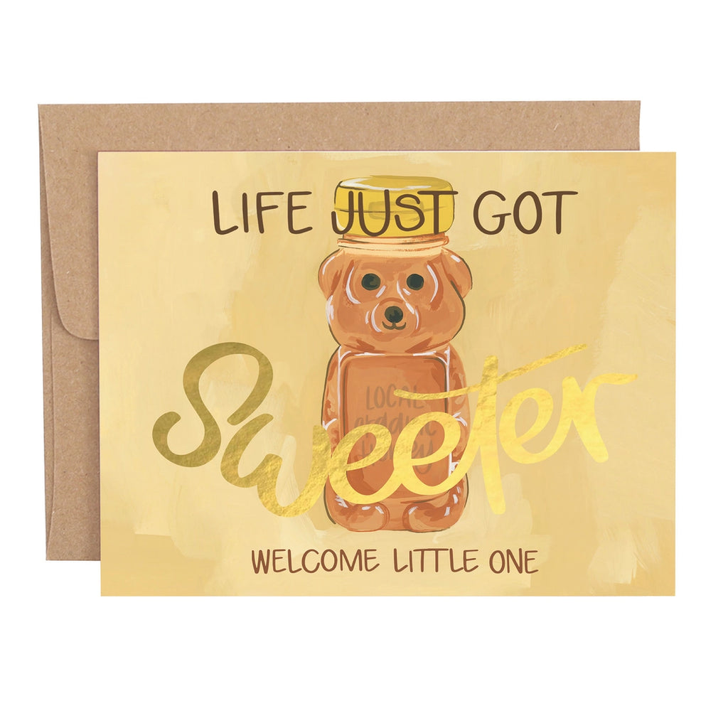 Welcome a new arrival with this Honey Bear Baby Greeting Card. Perfect for celebrating a baby's arrival, this sweet card is an ideal choice for conveying warm wishes to the new parents and welcoming the little one to the world.