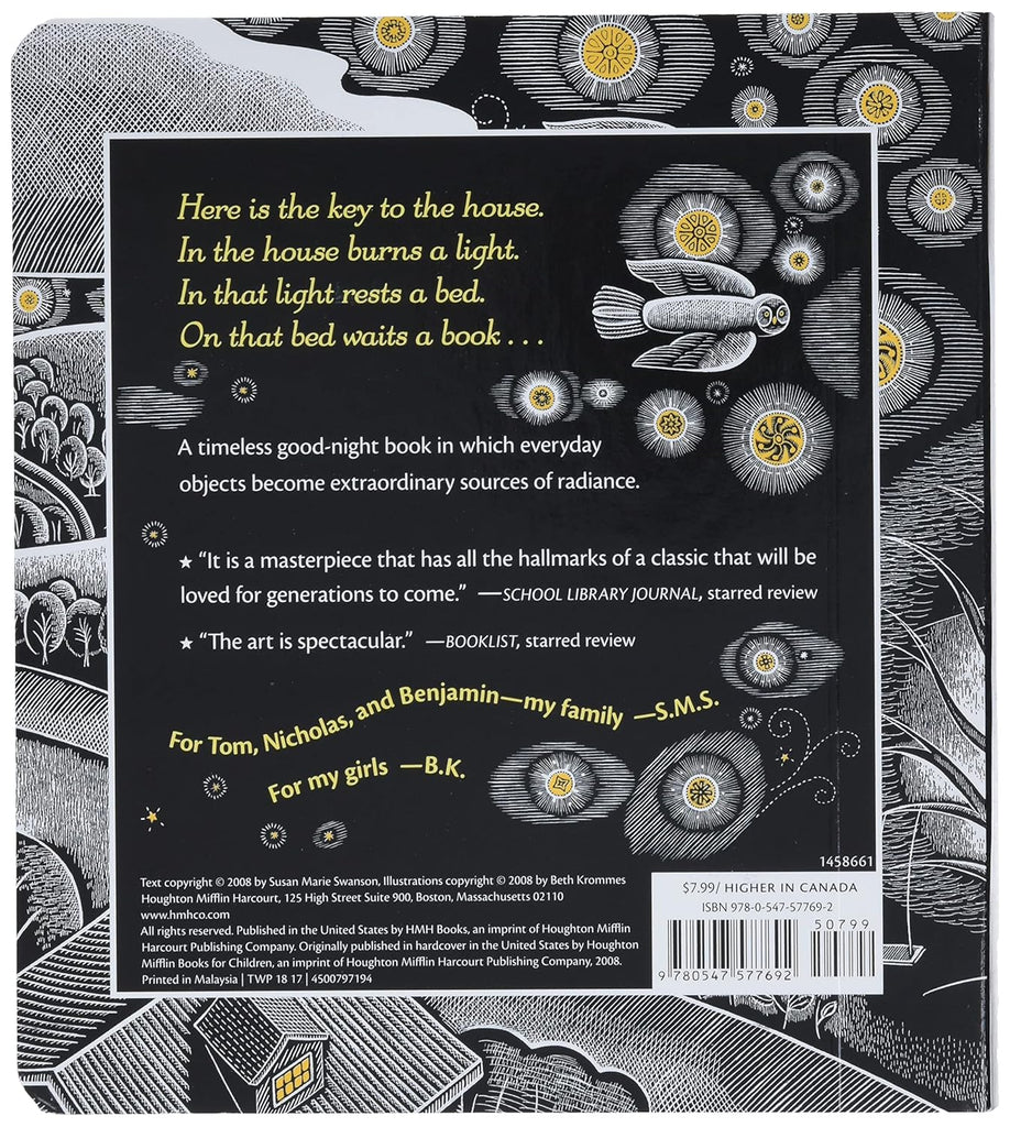 Inside the house are nighttime things both comforting and intriguing--a bed, many books--and outside, too, there are sources of light and joy--the moon, the sky--that reveal a reassuring order in the universe. This timeless bedtime tale takes readers through the house in the night, up into the sky, and back home again, all the while reminding us of the presence of love and wonder in our world.