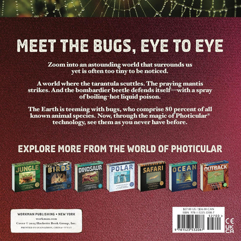 Another addition to the bestselling Photicular series with over 1.3 million books in print, Bugs zooms into the tiny world of insects. Watch a grasshopper diving for its pray, a house fly rubbing its fore legs, a tarantula skittering across the floor, a leaf-cutter ant hauling a giant leaf up a branch, a dung beetle pushing its ball up a hill, a close-up of a damselfly's enormous eyes, and more. BUGS offers readers an up-close look at bugs in motion and a window into how they move and behave. Science writer Mara Grunbaum provides an opening essay that delves into the fascinating behavior of these wonderful creatures as well as a detailed profile accompanying each image.