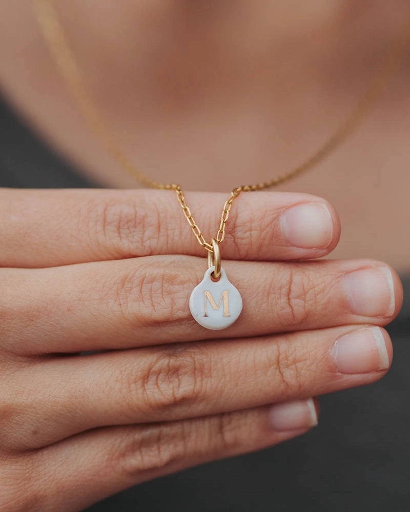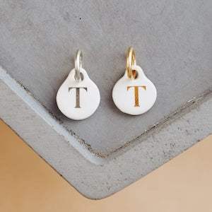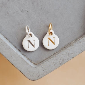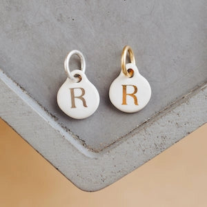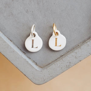 A sweet ceramic charm is fired with gold & silver initials and finished with a jump ring, ready to add to a chain or bangle bracelet.