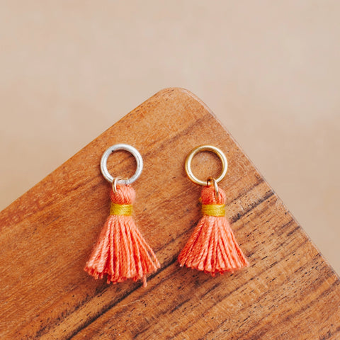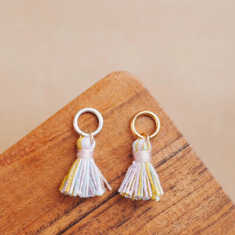 Charms are composed of thread tassels, finished with a brass base metal jump ring, and plated in the US with 24k gold and .999 fine silver. 0% nickel content.