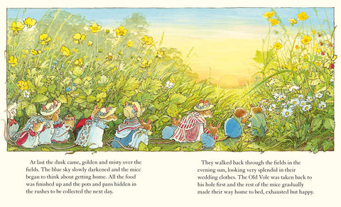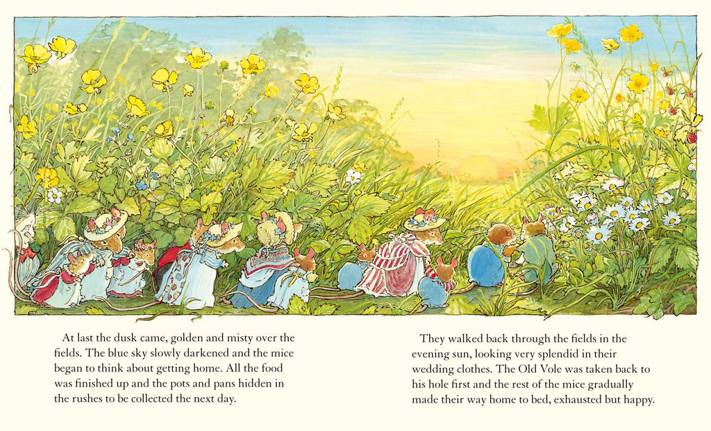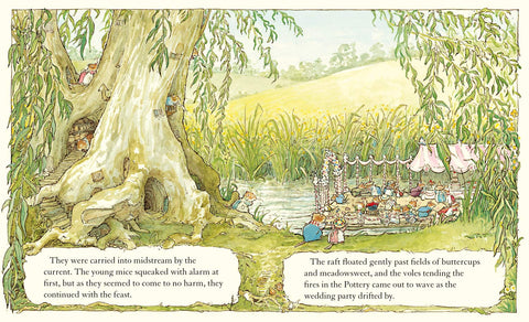 It was such a hot summer. They sky was deep blue and the sun never faltered. All along Brambly Hedge, the mice did their best to keep cool. Poppy Eyebright sought refuge in the mossy shadows of the mill wheel; Dusty Dogwood took to walking by the banks of the cooling stream. Dusty and Poppy spent more and more time together, so no one was at all surprised when they announced their engagement. They decided on a very unusual setting for the wedding ceremony, but even they didn't realise just how unusual it was prove to be!