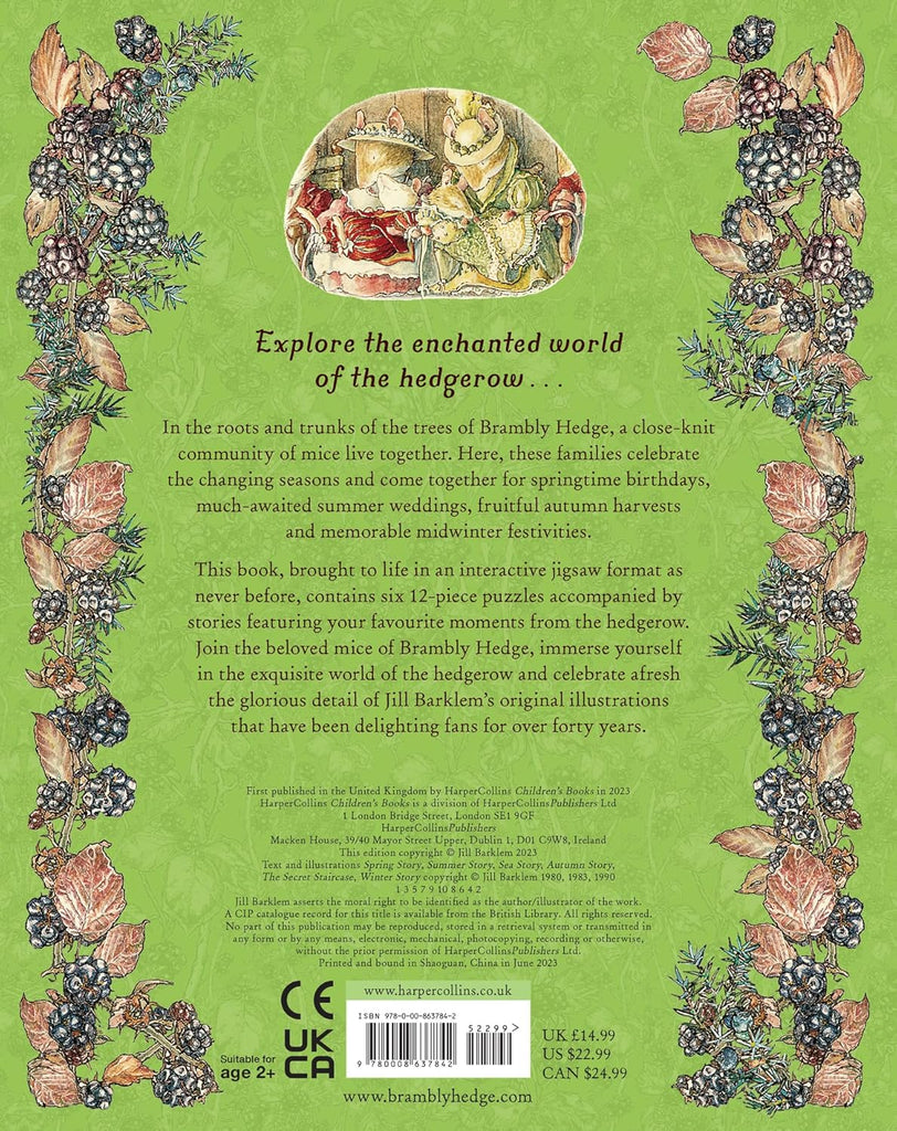 This interactive jigsaw book features six 12-piece puzzles accompanied by best-loved stories from the hedgerow. Experience the changing seasons with the mice of Brambly Hedge and join in with springtime birthdays, much-awaited summer weddings and memorable midwinter festivities. Delighting fans for over forty years, immerse yourself in the exquisite world of the hedgerow and celebrate afresh the glorious detail of Jill Barklem's original illustrations.