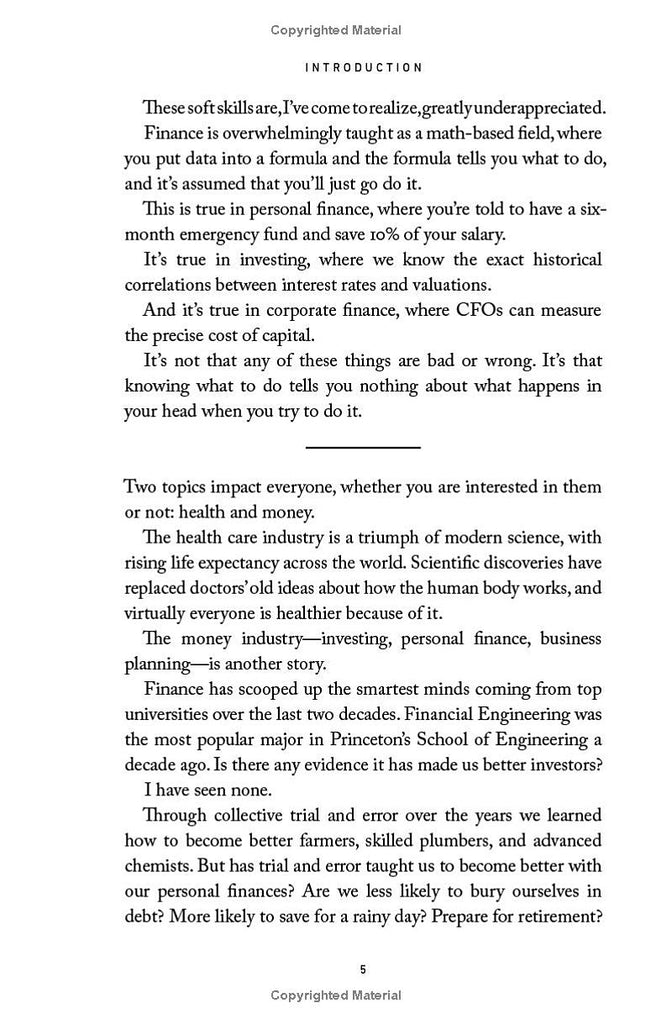 Money--investing, personal finance, and business decisions--is typically taught as a math-based field, where data and formulas tell us exactly what to do. But in the real world people don't make financial decisions on a spreadsheet. They make them at the dinner table, or in a meeting room, where personal history, your own unique view of the world, ego, pride, marketing, and odd incentives are scrambled together.