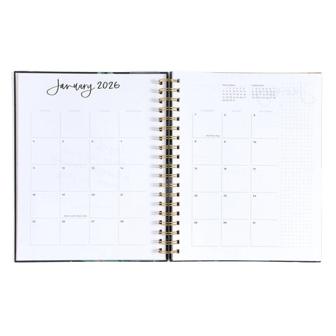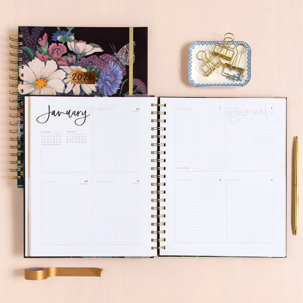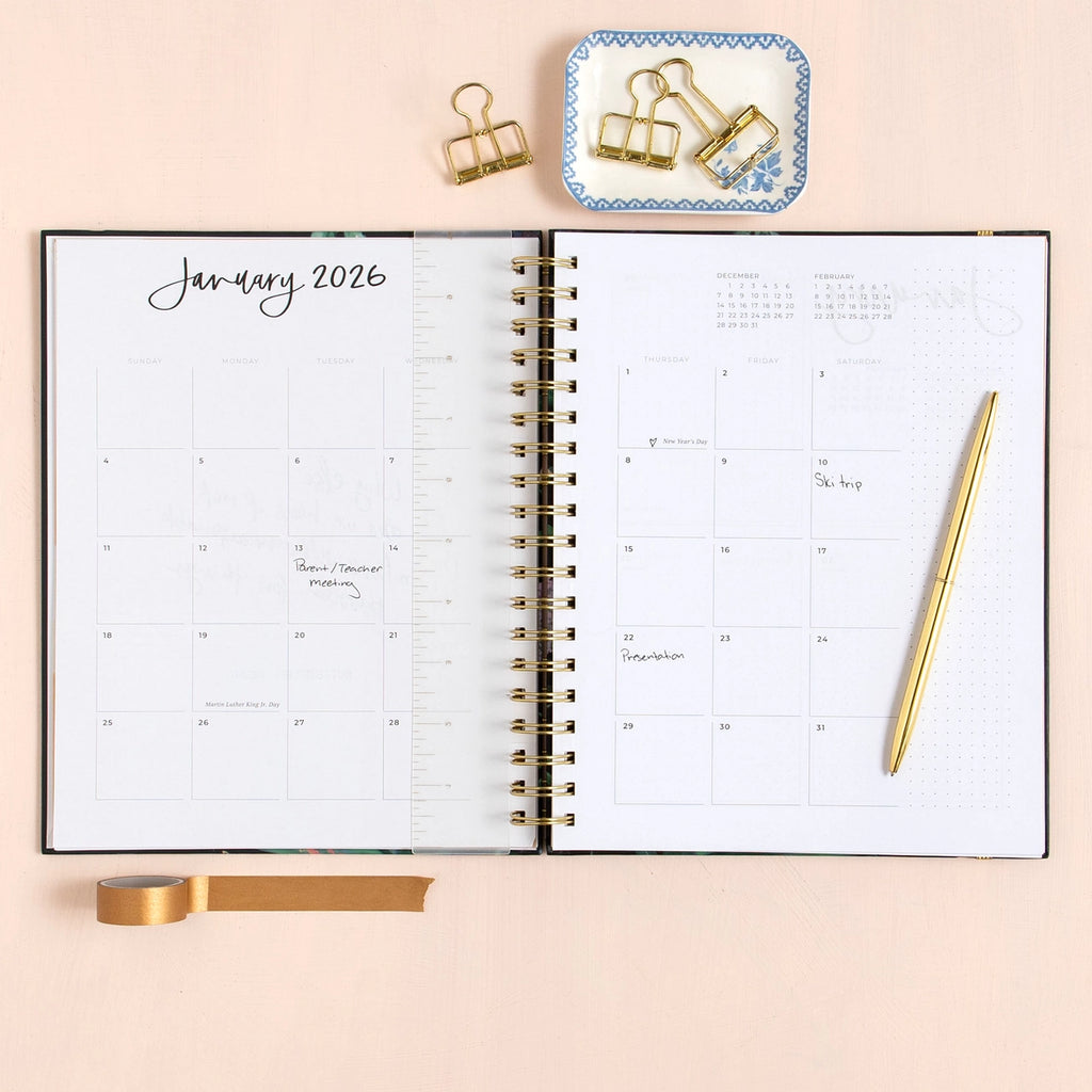 Stay inspired all year with the Riverbend 2026 Planner, featuring lush floral artwork and thoughtful details for effortless organization. Designed with a hardcover, gold wire-o binding, and an elastic closure, this weekly planner includes dot grid pages, a snap-in acrylic ruler bookmark, and plenty of space to plan your days. Perfect for goal-setting, scheduling, and keeping life beautifully on track. A stunning gift for planners, professionals, students, and stationery lovers!