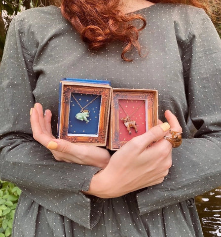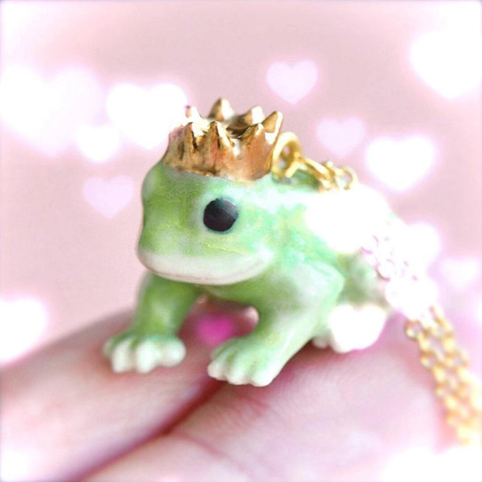 Step into a fairy-tale world with Camp Hollow's limited-edition Frog Prince Necklace! This handcrafted porcelain pendant brings to life the legendary frog prince, complete with a hand-painted vibrant green hue and a golden crown that's nothing short of regal. Strung on a delicate chain, this necklace is a whimsical yet elegant addition to any outfit, whether you're dressing casually or for a magical evening out.