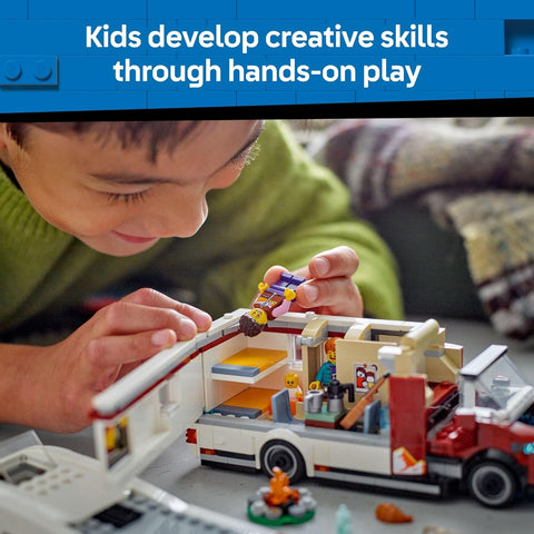 Kids can travel wherever their imaginations take them with the LEGO® City Holiday Adventure Camper Van toy. This fun vacation vehicle set for ages 6 and up comes with lots of realistic features, including a modern living space with a kitchen, toilet, bunk beds and crib. The set also includes a table and 2 chairs for indoor and outdoor use, plus a toy guitar and campfire. Just add the mom and dad minifigures with their baby for imaginative play and storytelling. This LEGO City camping toy includes a step-by-step printed construction guide. Kids can also enjoy a fun and intuitive building adventure with the LEGO Builder app, where they can zoom in, rotate the models in 3D, track their progress as they build, and explore and save other playsets. LEGO City Great Vehicles playsets deliver feature-rich land, air and water toys for imaginative play without limits.