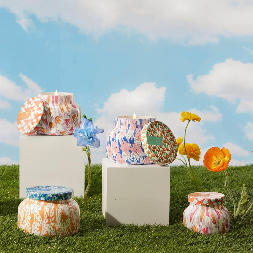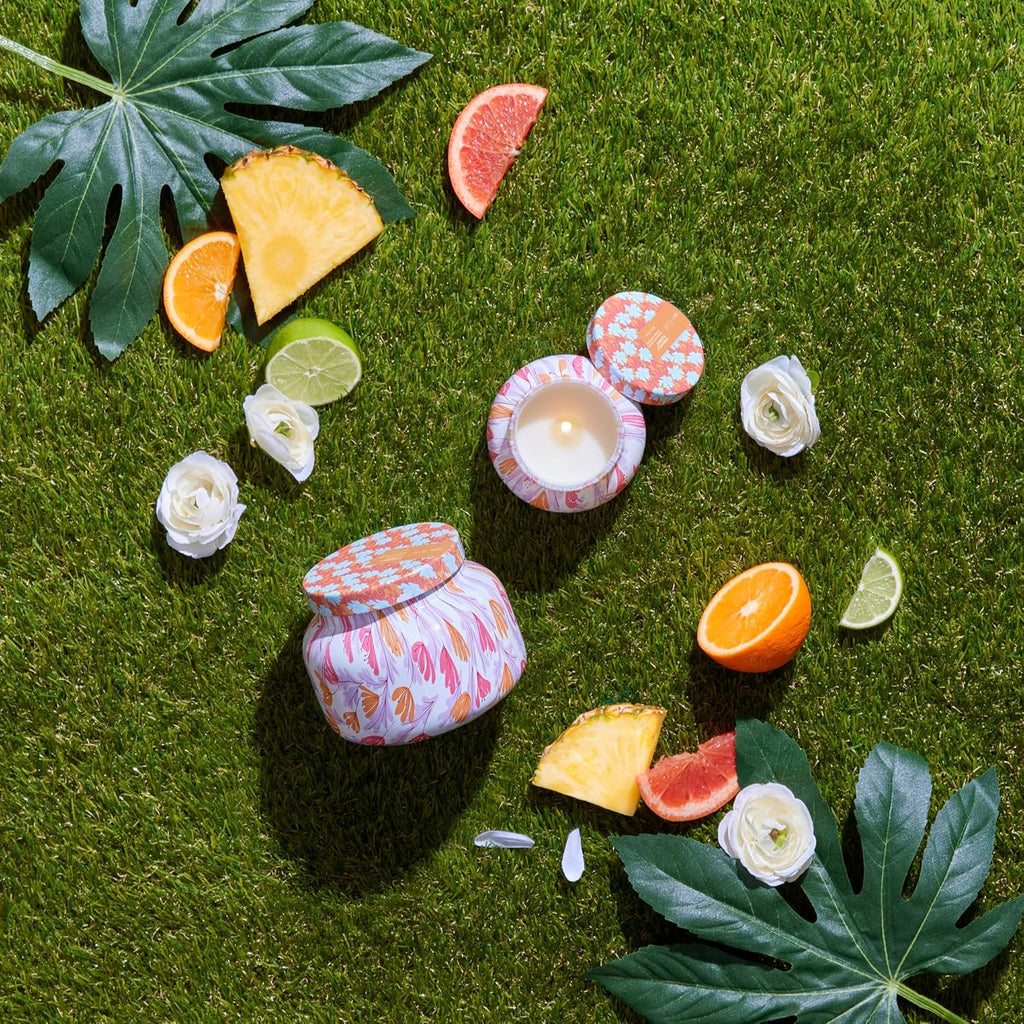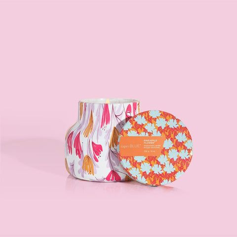 Double the pattern, double the fun! Make a statement with Capri Blue's Pineapple Flower Pattern Play Petite Candle. Fill your room with notes of pineapple, lemon flower and sugarcane to transform your space into a spring haven.