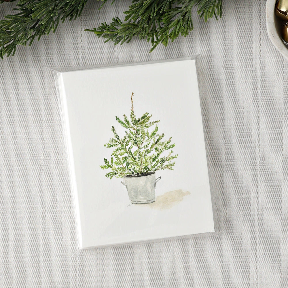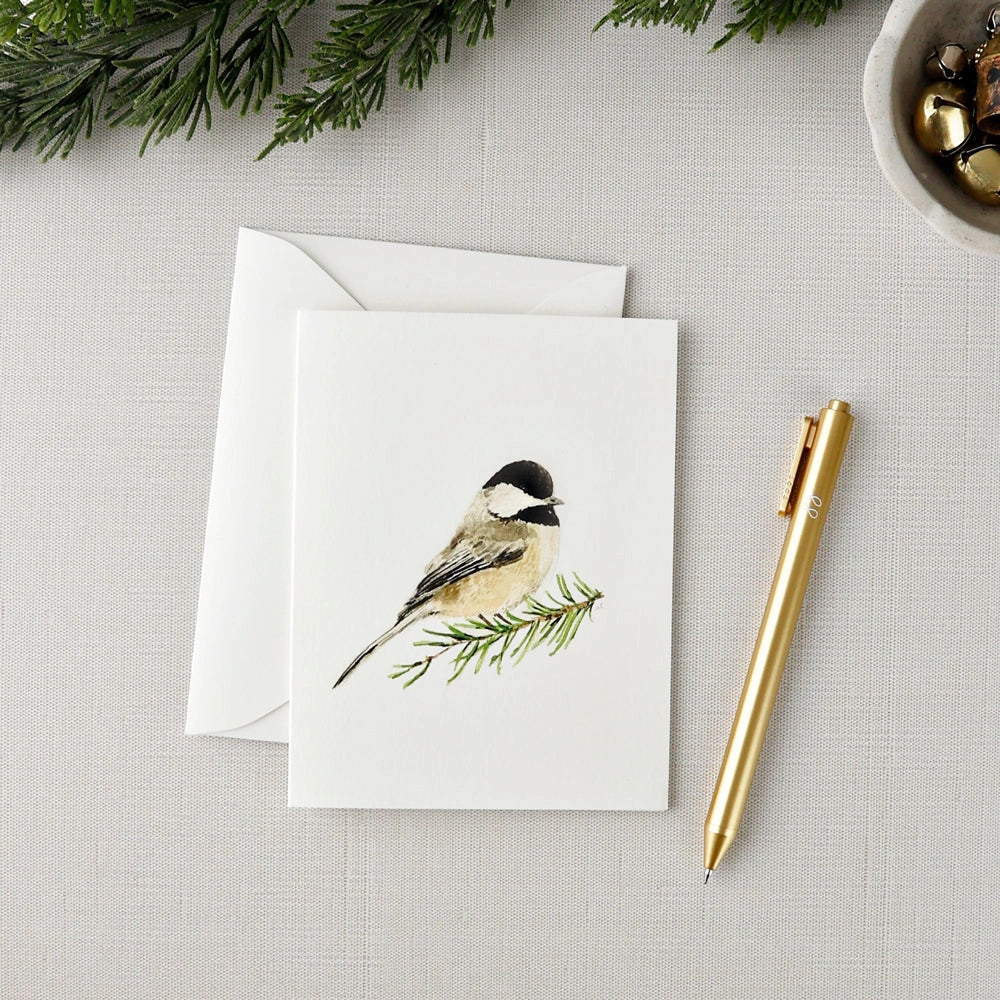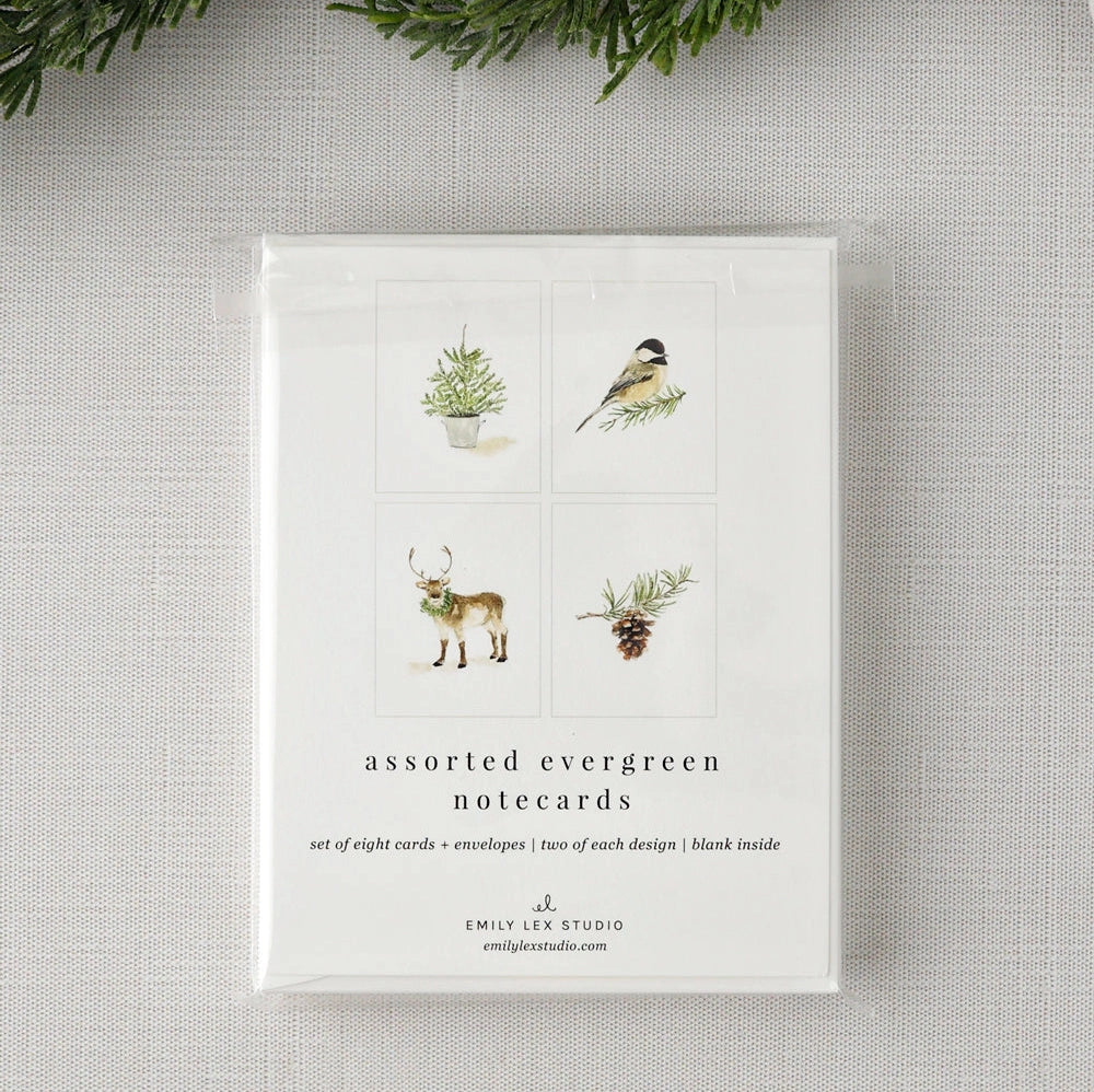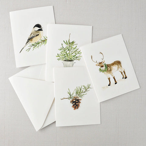 The assorted set of evergreen notecards are blank on the inside with charming watercolor illustrations of a chickadee, pinecone, reindeer and potted tree on the front. They bring a touch of delight to your Christmas cards, hostess gifts, thank you notes, housewarming gifts, get-well wishes, and more.
