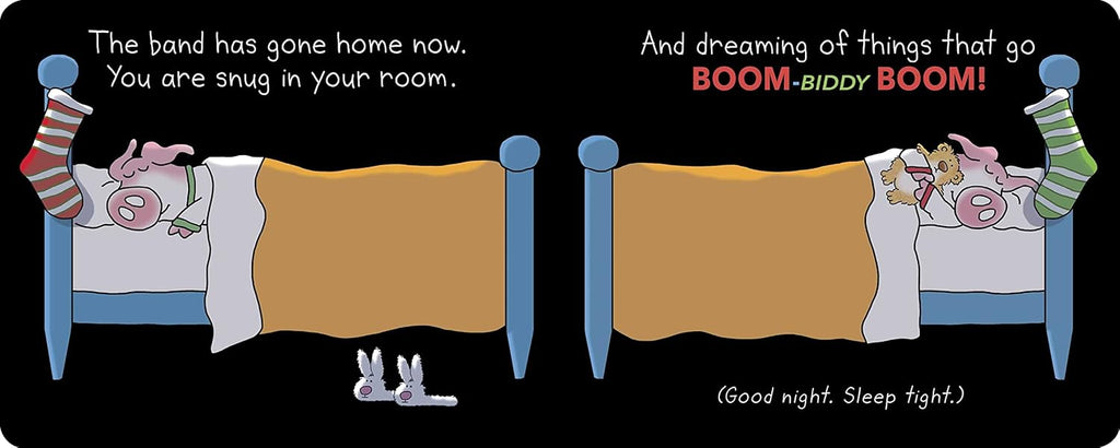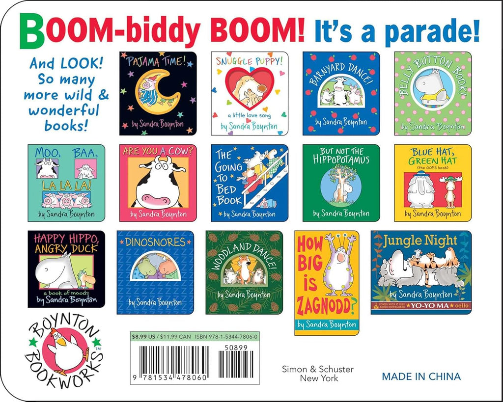 "This is one of those rare occasions where the board book edition is an improvement on the (beloved) original picture book...(Boynton's) signature trademarks remain, including a range of animal musicians, plenty of humor, a dynamic array of fonts, and pleasing read-aloud-ready sound effects ('BOOM-biddy BOOM!'). A Christmas parade worth watching and listening to all year long."-- " Horn Book Magazine"