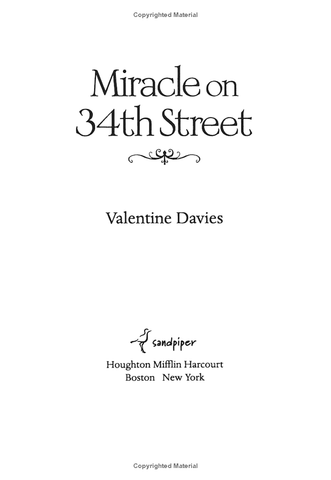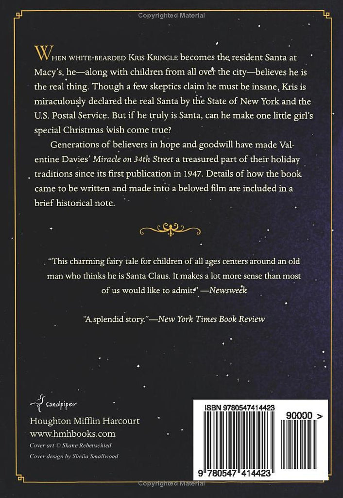 Generations of believers in hope and goodwill have made Valentine Davies's Miracle on 34th Street a treasured part of their holiday traditions. Millions of copies of this award-winning story have sold since its first publication in 1947, delighting readers of all ages. Details of how the book came to be written, and made into a beloved film, are included in a brief historical note.
