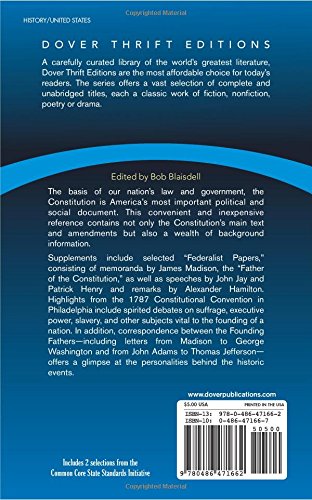 Supplements include selected "Federalist Papers," consisting of memoranda by James Madison, the "Father of the Constitution," as well as speeches by John Jay and Patrick Henry and remarks by Alexander Hamilton. Highlights from the 1787 Constitutional Convention in Philadelphia include spirited debates on suffrage, executive power, slavery, and other subjects vital to the founding of a nation. In addition, correspondence between the Founding Fathers -- including letters from Madison to George Washington and from John Adams to Thomas Jefferson -- offers a glimpse at the personalities behind the historic events. Includes 2 selections from the Common Core State Standards Initiative: The United States Bill of Rights and The Preamble and First Amendment to the Unites States Constitution.