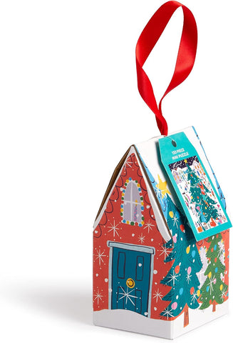 The Tree Decorating 130pc Puzzle Ornament from Galison features a brightly colored mini house-shaped ornament, festooned with Christmas Trees, ornaments and lights in Christmas brights. The mini 130 piece puzzle captures an outdoor tree decorating moment under the stars.