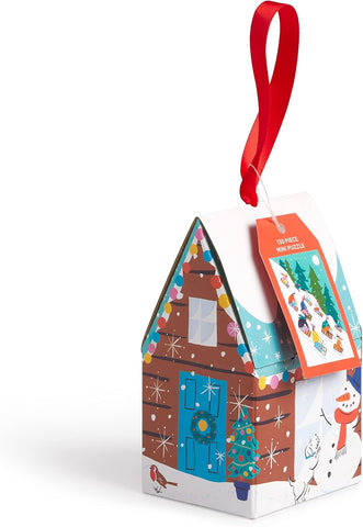The Winter Sledding 130pc Puzzle Ornament illustrated by Louise Cunningham, captures a snowy Christmas season, featuring a Christmas Alpine-themed house and a mini 130 piece winter sledding puzzle image.