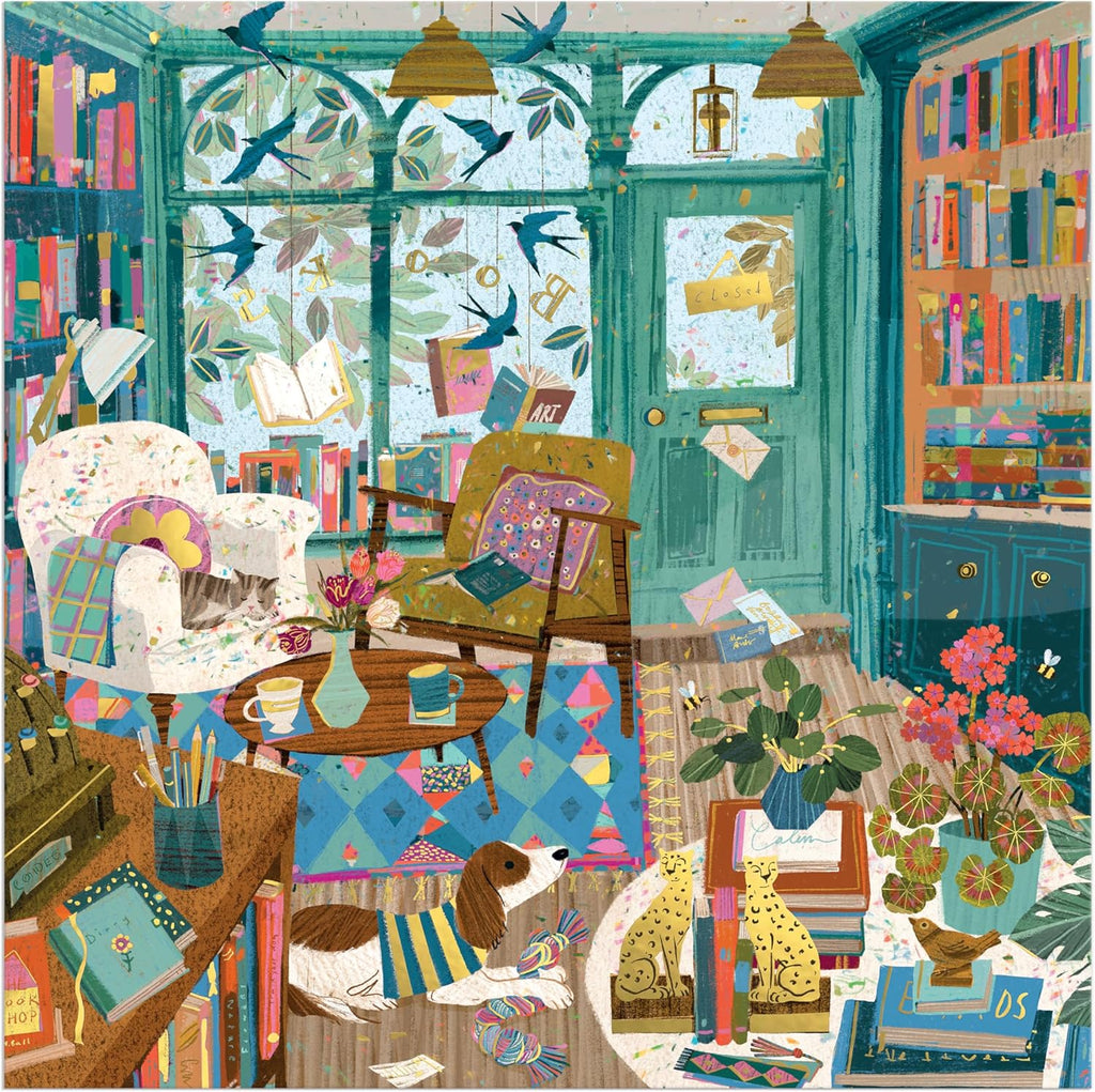 500 PIECE PUZZLE - Step into the inviting warmth of a beloved bookshop with our charming 500-piece puzzle featuring artwork of a cozy scene adorned with comfy chairs nestled among towering bookshelves. Each piece of this puzzle captures the timeless charm and comforting ambiance of a sanctuary for book lovers, inviting you to lose yourself in the serenity of a good read. As you unravel the puzzle's intricacies, feel the sense of accomplishment with each fitting piece, and witness the scene come to life.