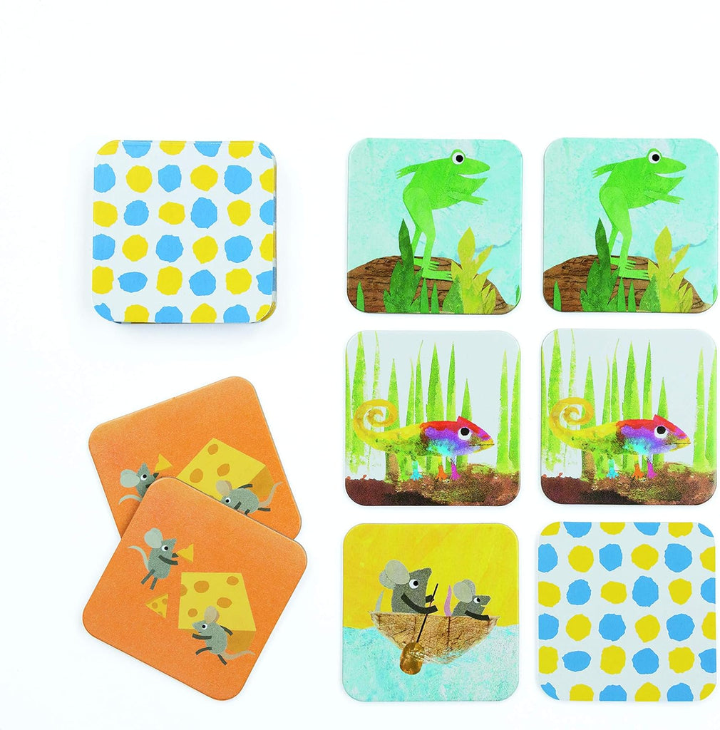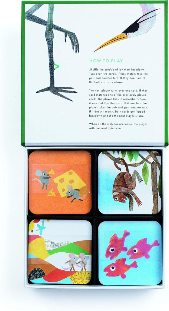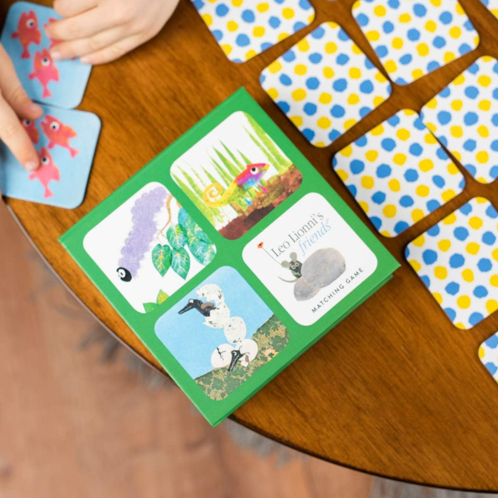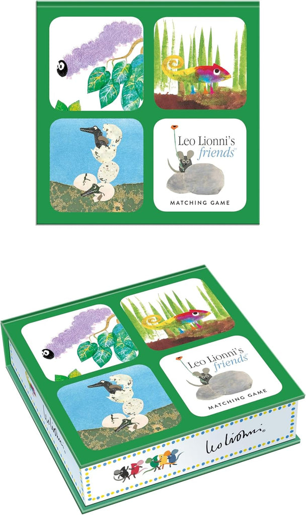 Leo Lionni's Friends Matching Game works your child's memory and language skills with 40 matching pieces, featuring 20 illustrations of Swimmy, Alexander, Frederick, the Extraordinary Egg, and more characters and objects from Leo Lionni's bestselling children's books. The pieces are stacked in four piles with a bellyband inside the box so you can open it and see the sturdy pieces and bright, beloved illustrations.