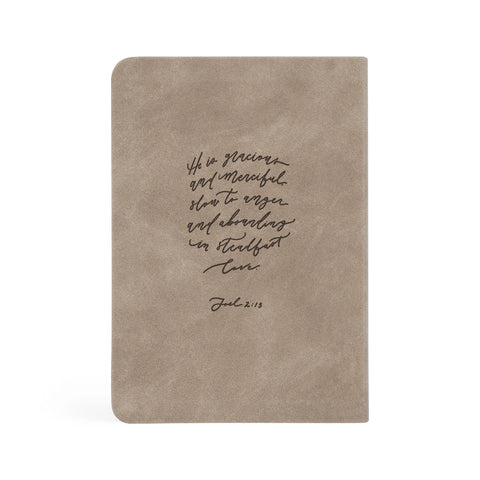 This beautiful notebook is the perfect companion to our Marlo Notetaking Bible. The back of this notebook features a verse from Joel 2:13 that says, "He is gracious and merciful, slow to anger and abounding in steadfast love."