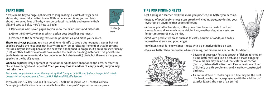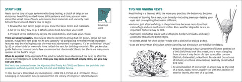 The booklet provides a dichotomous key to identifying aboveground bird nests. Simply answer a series of simple questions about the type, size, and location of the nest, as well as the materials from which it's made. Along the way, professional illustrations help to guide you to a positive identification.
