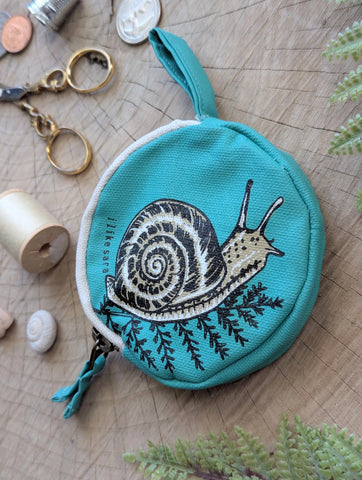 This snail pouch will happily store your spare change, ear buds, travel sewing supplies, on-the-go candy stash, etc! Hand-screenprinted in teal, black, tan, and white inks onto cotton canvas, this little pouch will help corral your small things and look cute doing it. Featuring a water-resistant lining, metal zipper (with fabric pull), and carrying loop, this pouch design is based on an original illustration by ilikesara / Sara Schalliol-Hodge. Use it as a coin purse, ear bud holder, travel sewing kit, gift bag, purse organizer, treasure pouch, or snack bag
