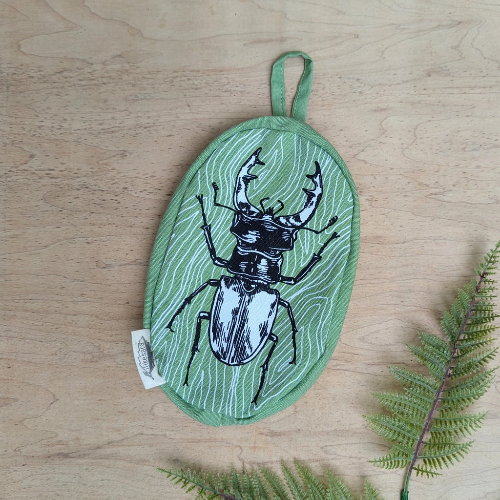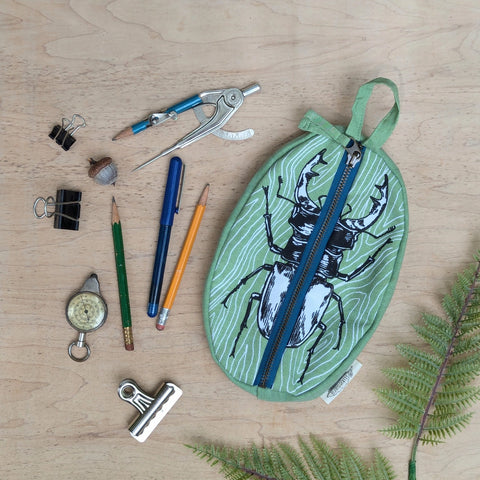 This lucky stag beetle will happily store your pencils, small supplies, or cosmetics. Featuring a water-resistant lining, metal zipper, and carrying loop, this pouch design is based on an original illustration by ilikesara / Sara Schalliol-Hodge. Use it as a pencil pouch, gift bag, cosmetic bag, purse organizer, treasure pouch, or snack bag.