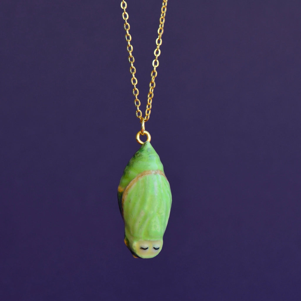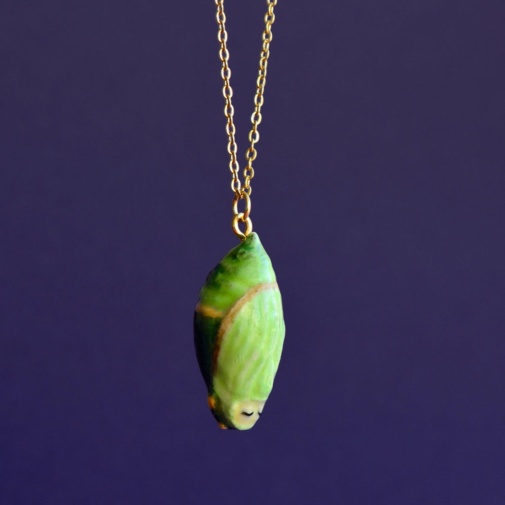 Experience the magic of transformation with Camp Hollow's Chrysalis Necklace. This hand-painted porcelain pendant embodies the essence of spring and the beauty of life's transitional moments. Brilliantly green and exuding serenity, it's a celebration of nature's miracles.