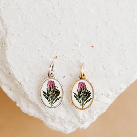 This Protea pendant charm is made by hand, encasing & sealing an original image in layers of resin.