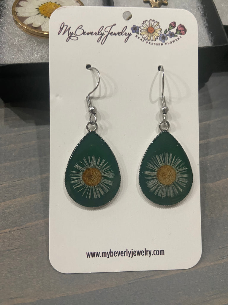 These teardrop earrings hold pressed Fleabane (Wild Daisy). It is a perfect accessory for those who love nature and flowers!