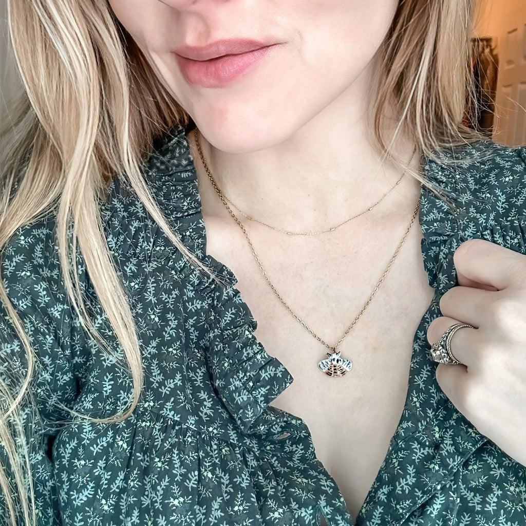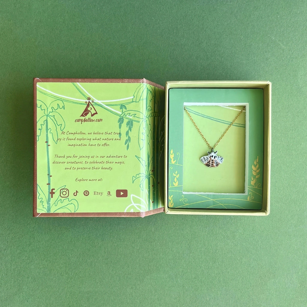 Immerse yourself in the mystique of Camp Hollow's Twilight Veil Moth Necklace, a tribute to nature's endless cycle of change and mystery. Inspired by a unique species from the lush jungles of Camp Hollow, this necklace is a gentle nudge towards embracing personal transformations with grace.
