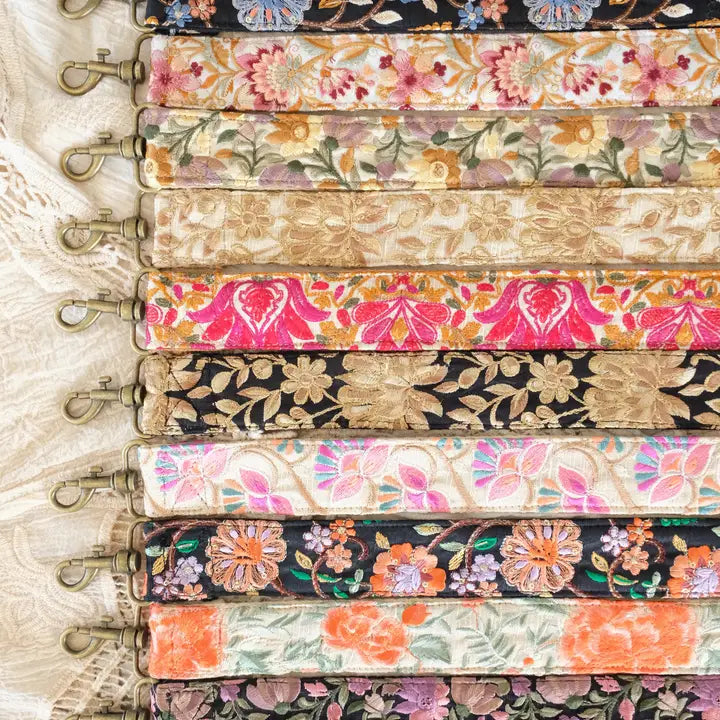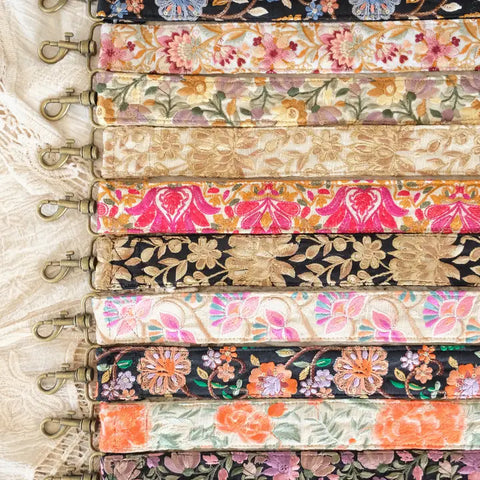 The beautiful handmade Straps by La N'atelier are made of 50% embroidered silk and 50% cotton. The hooks are made of bronze metal. Use these beautiful straps as a phone cord, bag handle or as a camera strap!