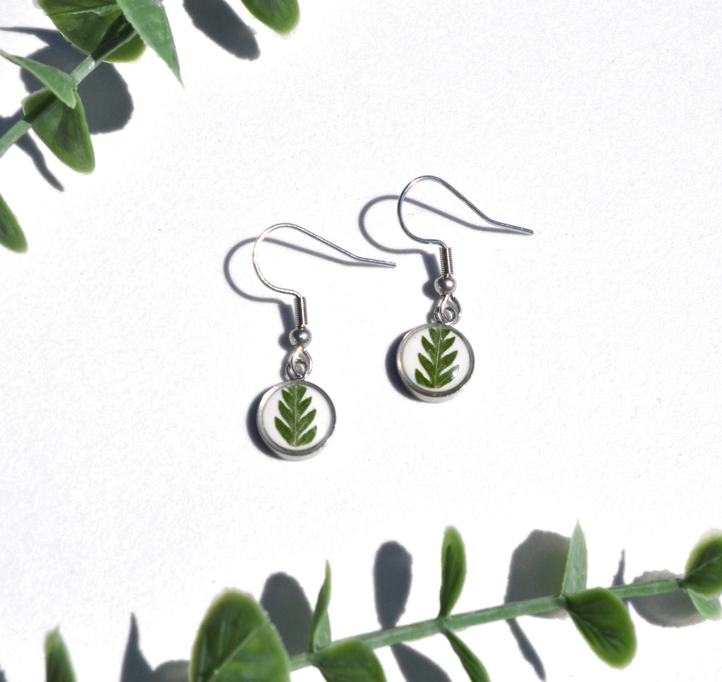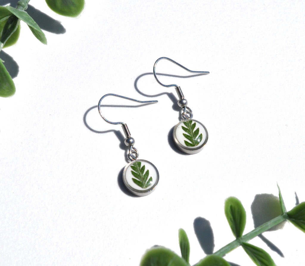 These stainless steel dangle earrings hold individual ferns. It is a perfect accessory for those who love nature and flowers!