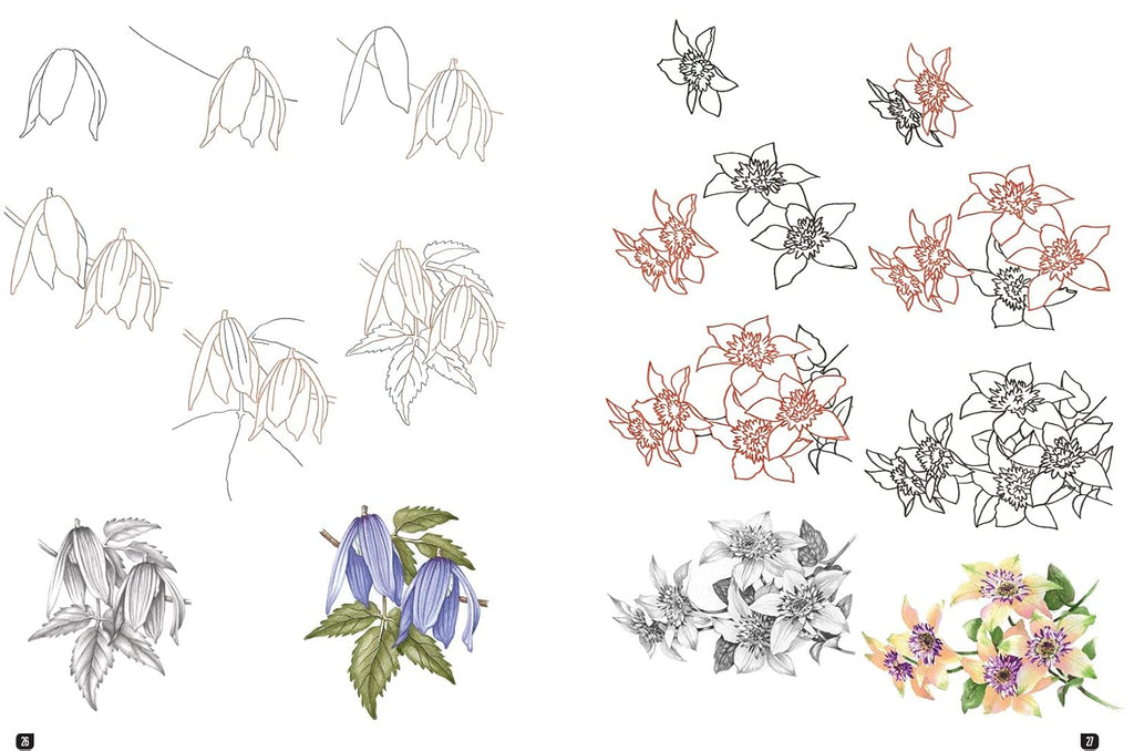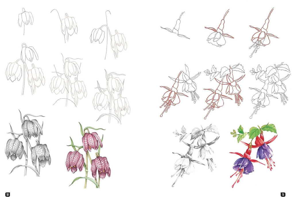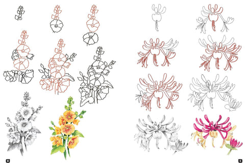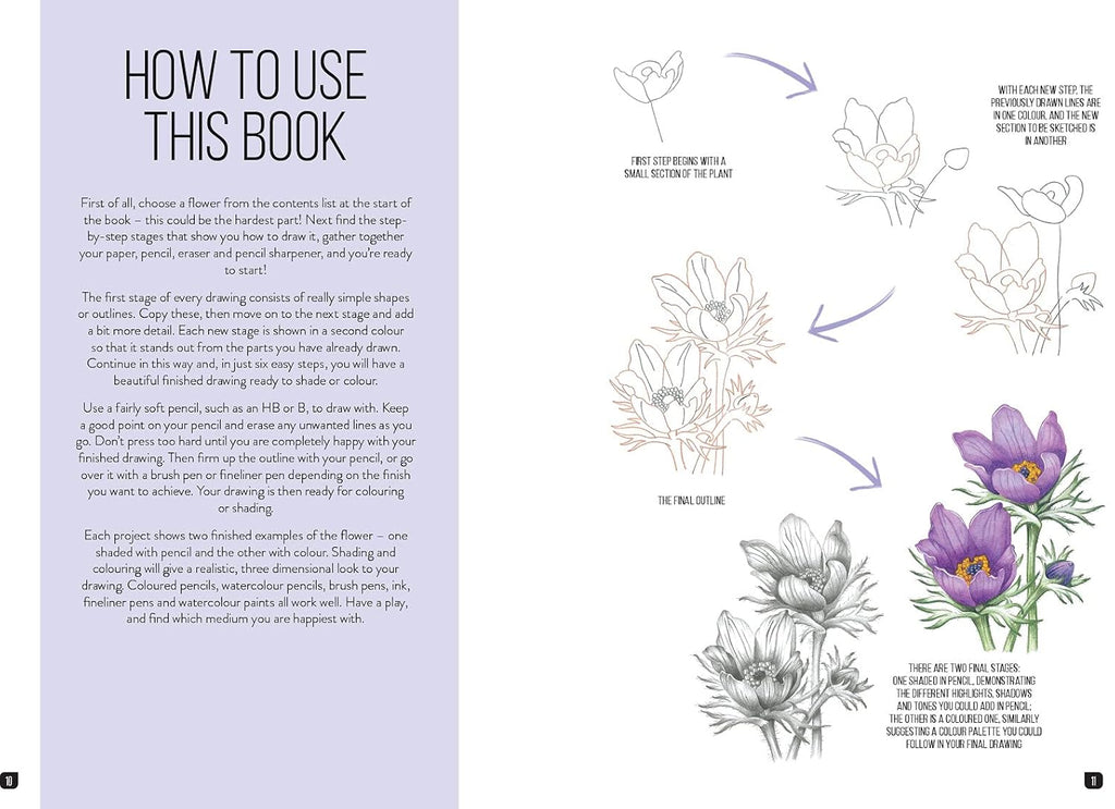 The process for sketching each flower is broken down into 8 easy steps: by drawing a few simple shapes a stage at a time, you can create a gorgeous, realistic bloom in very little time. There are also two shaded-in versions of each flower, one in pencil and the other in paint, to offer you inspiration for adding final touches to your own drawn flower.