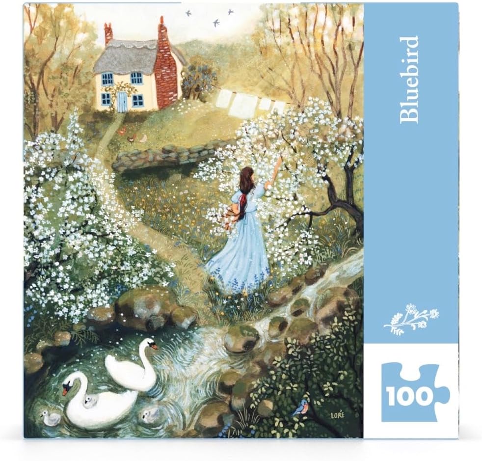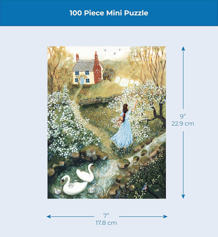 Bring a touch of nature’s charm into your day with the "Bluebird" 100 Piece Mini Puzzle. This enchanting scene, illustrated by Loré Pemberton, captures a tranquil countryside moment. A young woman in a flowing blue dress reaches for a flowering tree branch in a blooming spring garden. Nearby, a pair of elegant swans glide across a gentle stream, accompanied by their fluffy cygnets. A quaint cottage nestled among lush greenery, with laundry drying in the sun, adds to the idyllic charm, while a vibrant bluebird perched nearby completes the serene tableau.