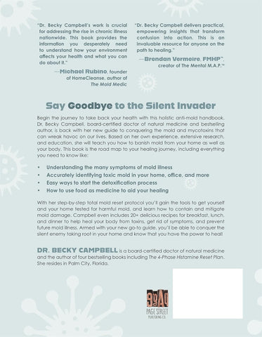 With her step-by-step total mold reset protocol you'll gain the tools to get yourself and your home tested for harmful mold, and learn how to contain and mitigate mold damage. Campbell even includes 20+ delicious recipes for breakfast, lunch, and dinner to help heal your body from toxins, get rid of symptoms, and prevent future mold illness. Armed with your new go-to guide, you'll be able to conquer the silent enemy taking root in your home and know that you have the power to heal!