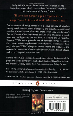 Oscar Wilde was at once a family man and a homosexual outsider, a socialite, socialist, and Irish nationalist. His contradictions inspired him to ponder the roles and masks donned in conventional society, and his acute and wry insights are wonderfully displayed in this collection of his essential plays. Known not only for his brilliant, epigrammatic language, but also for his sense of theatrical design, color, and staging, Wilde created an enduring body of finely crafted works, whose delights and ironies still speak to modern audiences. In addition to Lady Windermere's Fan, Salomé, A Woman of No Importance, An Ideal Husband, A Florentine Tragedy, and The Importance of Being Earnest, this edition contains an introduction, notes and commentaries, and an excised scene from The Importance of Being Earnest.