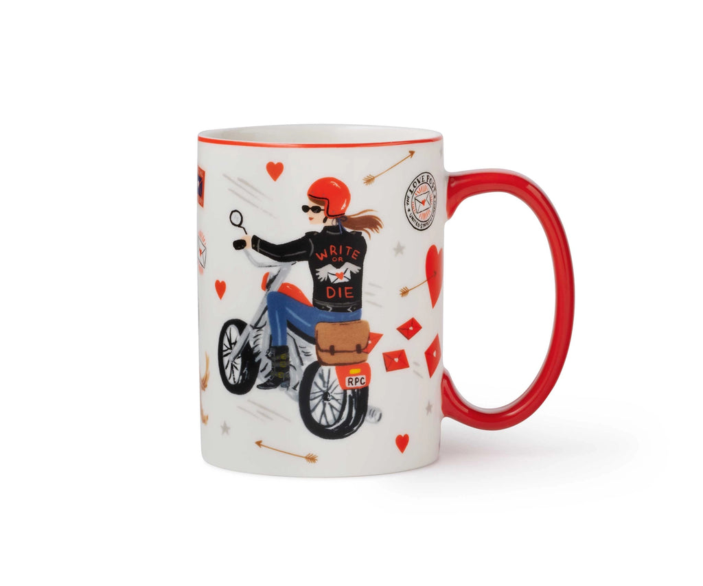 With a playful “Write or Die” illustration and red handle and rim, this seasonal mug brightens the morning routine.