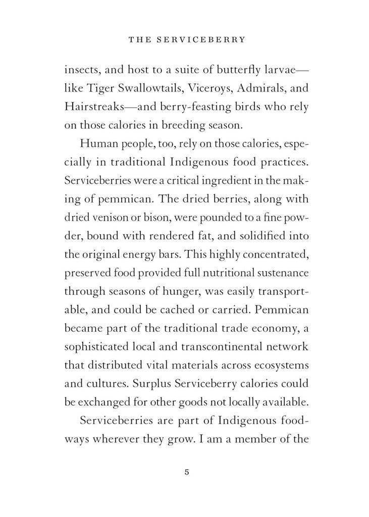 "Kimmerer, drawing from her Potawatomi heritage, uses the abundant serviceberry to demonstrate the gifts that the natural world provides. This portrait is startling in its simplicity, resulting in a masterful reflection on ecology and culture. The book seamlessly blends science, inherited wisdom, and philosophy . . . [Kimmerer's] beautiful and hopeful prose leaves readers feeling sated, galvanized, and keenly aware of the world around them. A welcome meditation on living in harmony with the earth and fostering deeper connections with one another." --Kirkus