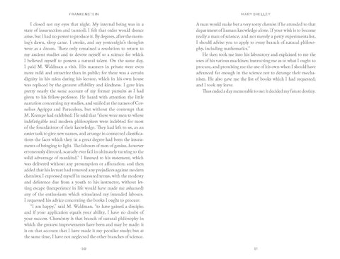 Dr. Victor Frankenstein never considers the consequences of his obsession. In his zeal to understand and harness the secret of life, he neglects his family and friends, isolates himself from the world, and ignores his own health. For years, he labors to create a new race of intelligent beings. He spends his nights scrounging human and animal body parts from graveyards, slaughterhouses, and hospital dissection rooms. By day he experiments in his secret laboratory, learning from his mistakes and perfecting the creature who, he believes, will worship him as a god. But this hubris is not his only sin. When he succeeds, Frankenstein is horrified by the ugly brutishness of the patchwork being he has brought to life. Rather than exult in his accomplishment, he runs from it, retreating to the comfort of long-neglected friends and family. Frankenstein has, indeed, created a monster. Not by reanimating dead flesh, but by abandoning his creation and planting within it the seeds of rage and loneliness. Now, the monster is out for revenge.