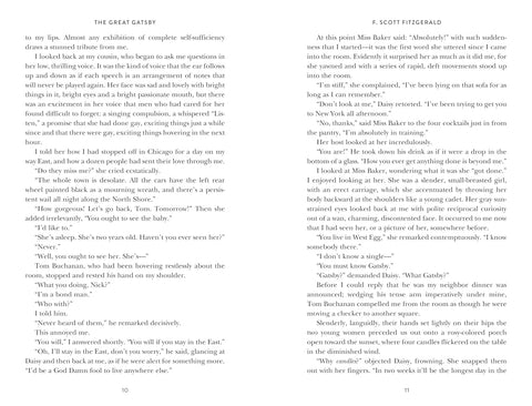 When Nick Carraway moves to West Egg, Long Island, he has no idea that the lavishly outfitted mansion next to his modest house is home to Jay Gatsby. Eventually, Nick becomes aware of Gatsby's intense interest in his cousin Daisy Buchanan, and when Daisy's brutish husband, Tom, probes Gatsby's background, he uncovers unsavory revelations about his rival's wealth. First published in 1925, F. Scott Fitzgerald's third novel offers a definitive portrait of the opulence and recklessness of the Jazz Age.