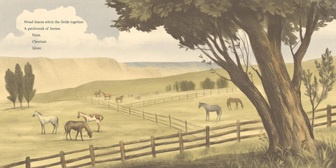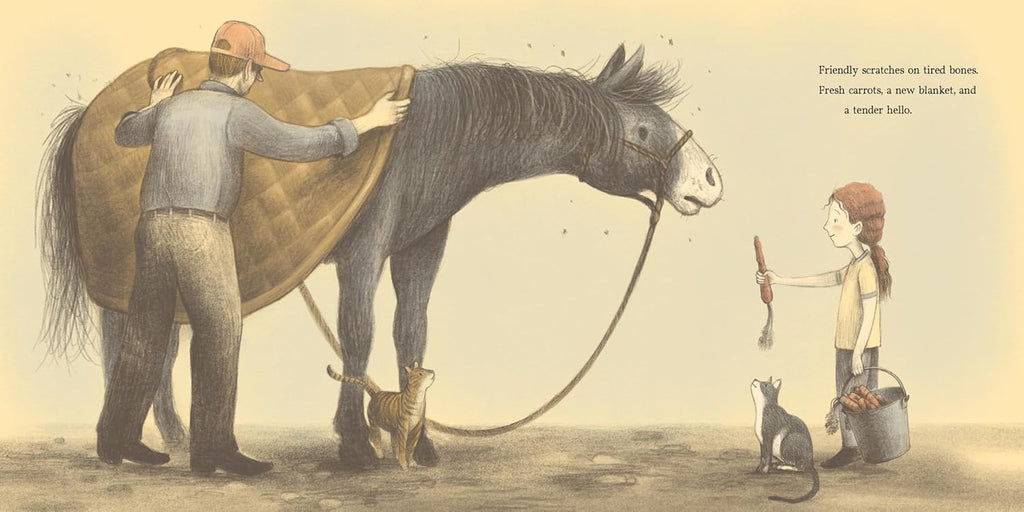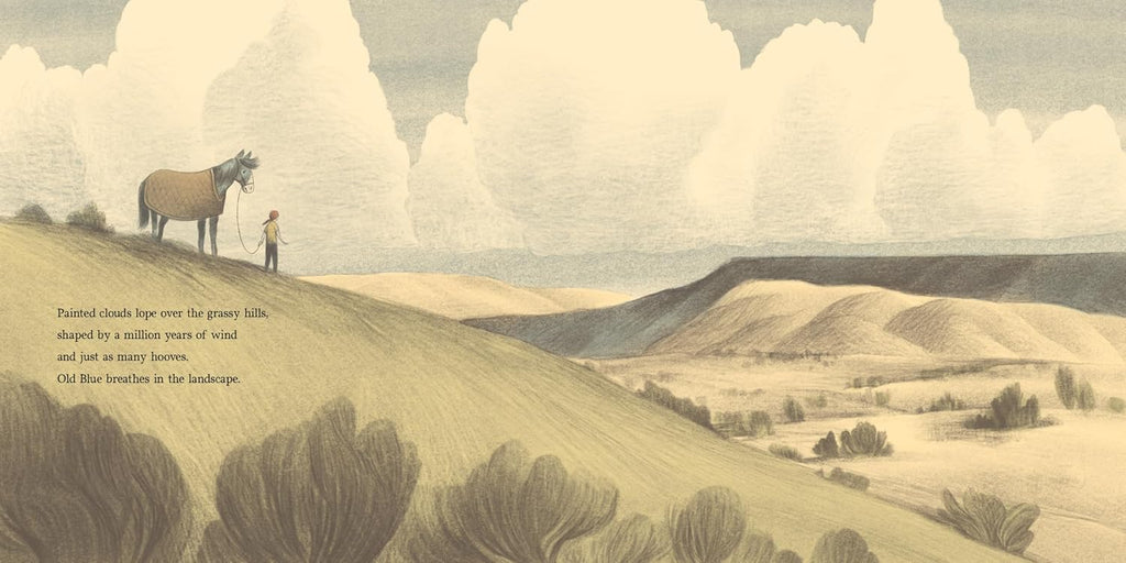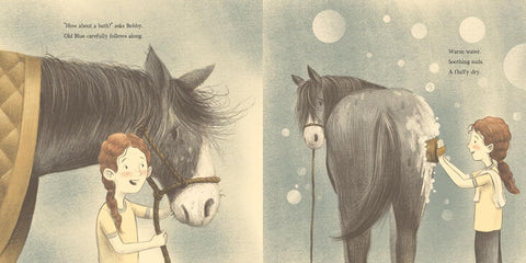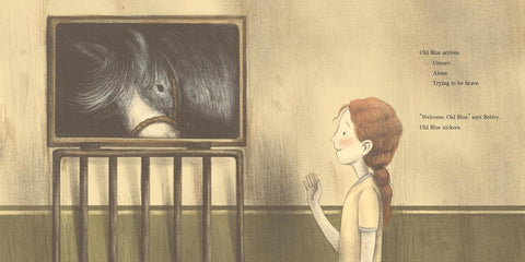 As it turns out, there is a warm greeting waiting for Old Blue. Friendly pats, fresh carrots, soft voices, and tender hands welcome the old horse. And there is a young girl, Bobby, who is eager to show Old Blue around. With the big blue sky high above rolling green hills and horses galloping through the pastures, Old Blue takes it all in.