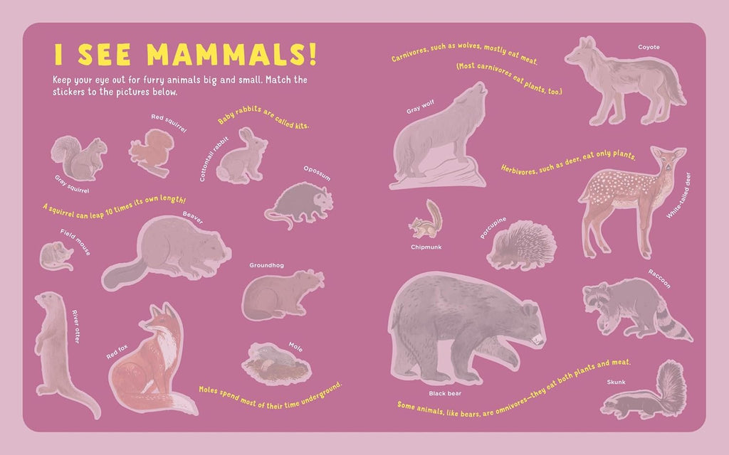 Sticker Play Pages: Scavenger hunts (Birds, Animals, Plants, Trees, Rocks, Bugs), Build a Habitat Scene (forest, pond life, beach), Nature trail map and adventures
