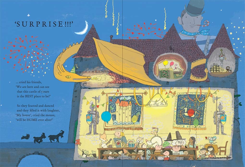 The little gray mouse is about to give up when he comes face to face with the most spectacular house of all: a glorious castle (Sleeping Beauty's). Its ballrooms, turrets, and drawbridge win him over, but he finds himself feeling alone, until-- surprise!--his friends from the forest and all those he has met along the way come to the castle, where they feast and dance, and the little gray mouse learns that it is family and friends that turn a house into a home.