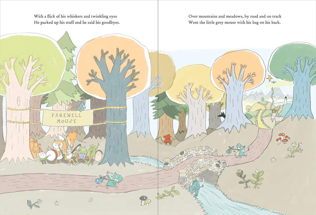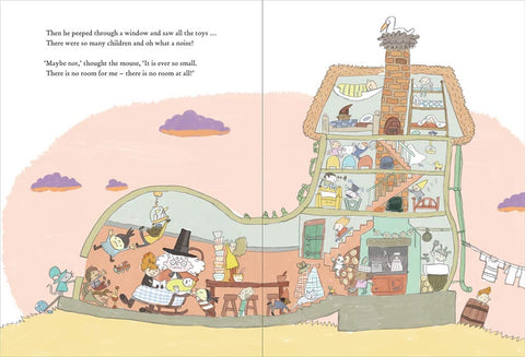 In a faraway land, a little gray mouse leaves his tiny hole in search of a new home. On his journey, he unwittingly encounters some of the biggest stars in the fairytale genre. He discovers a house shaped like a shoe (belonging to Old Mother Hubbard), which he concludes would be too noisy; he dines with a little pig in a house made of straw (awfully breezy); is flummoxed by a tower with no door (Rapunzel's); and dares to take a nibble from a most remarkable house made of gingerbread (narrowly missing Hansel and Gretel).