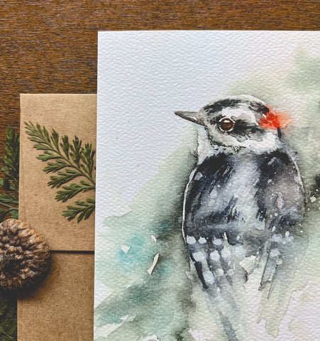 Downy Woodpecker Watercolor printed locally on 90# textured paper to mimic watercolor paper