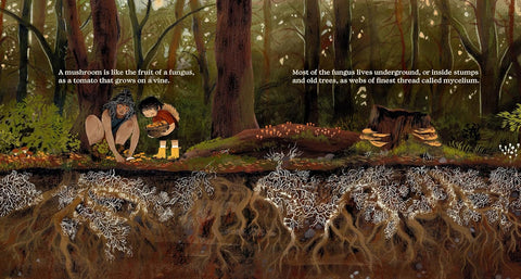 "The mycelium is depicted as a beautiful, feathery network beneath the ground where the pair crouch. The almost-ghostly white color of it is easily seen among tree roots, nicely portrayed by the gouache, ink and oil pastel artwork." --Youth Services Book Review