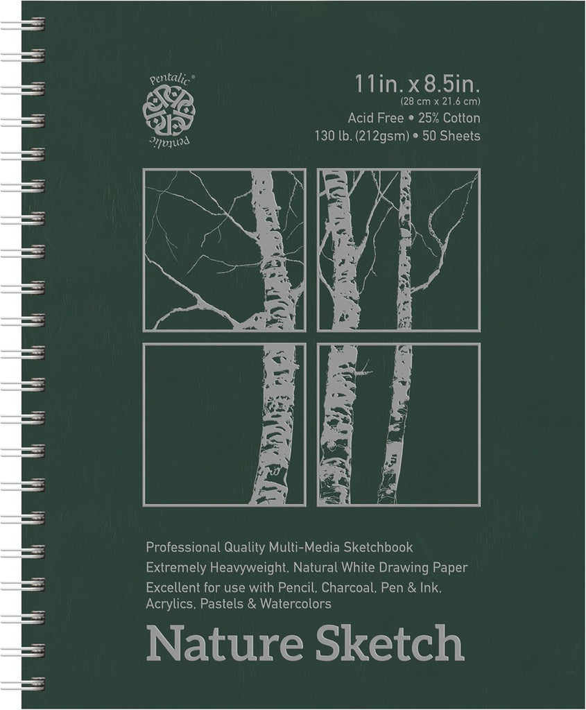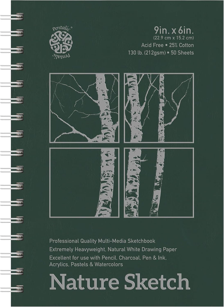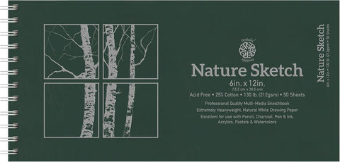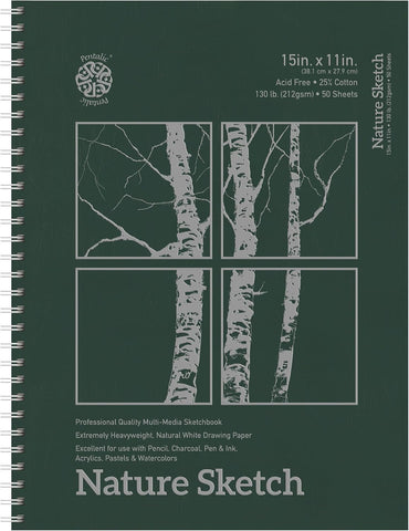 Nature Sketch is the go-to artist heavyweight paper that accepts pencil, pen, ink, markers, pastels and oil pastels, charcoal, watercolor pencils, light washes and acrylic. The sketchbook contains 50 pages of 130 lb (211 g/m2), 25% cotton, cream-colored paper with a medium tooth surface.