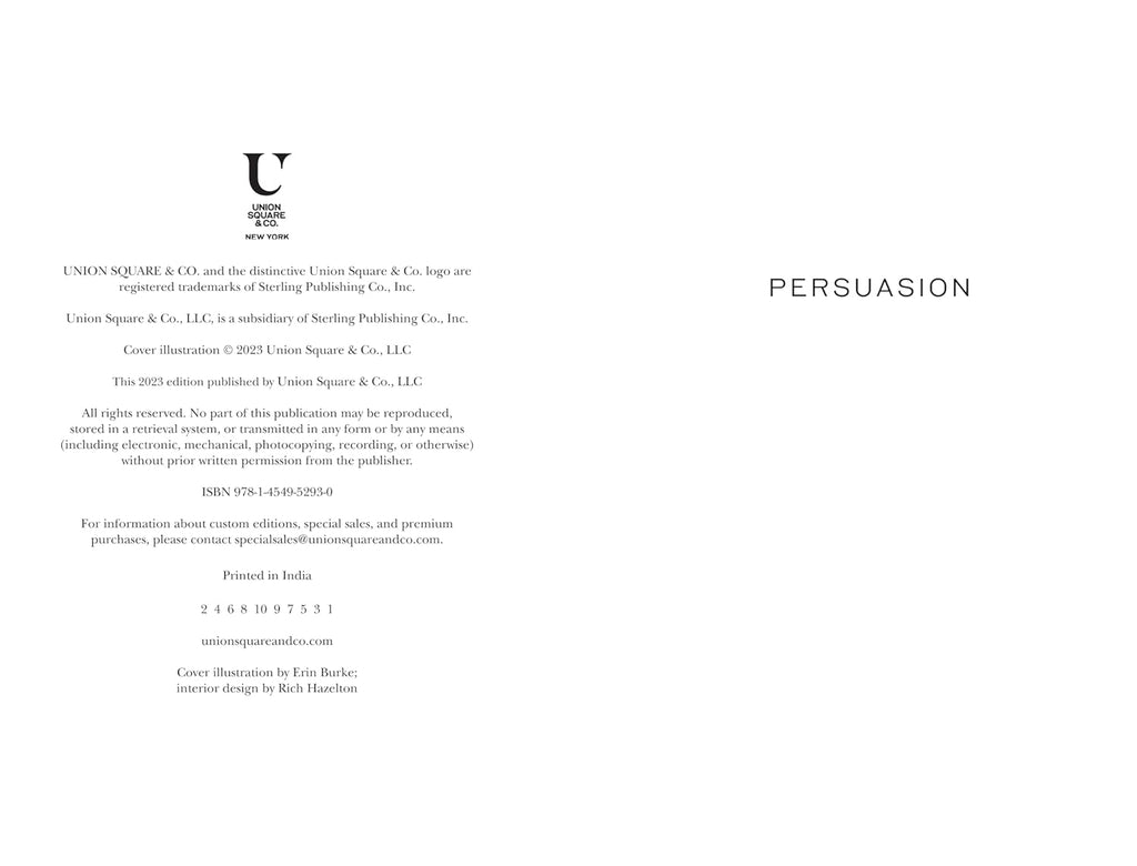 Discover the story of Jane Austin's Persuasion with this exquisite edition from Union Square & Co.'s Signature Gilded Editions series! The stunning Persuasion special edition features sprayed edges, color end pages, a built-in ribbon bookmark, and embossed foil cover. The beautiful design and attention to detail set this special edition book apart, whether you're reading for the first time or building a library of your favorite classic literature books.