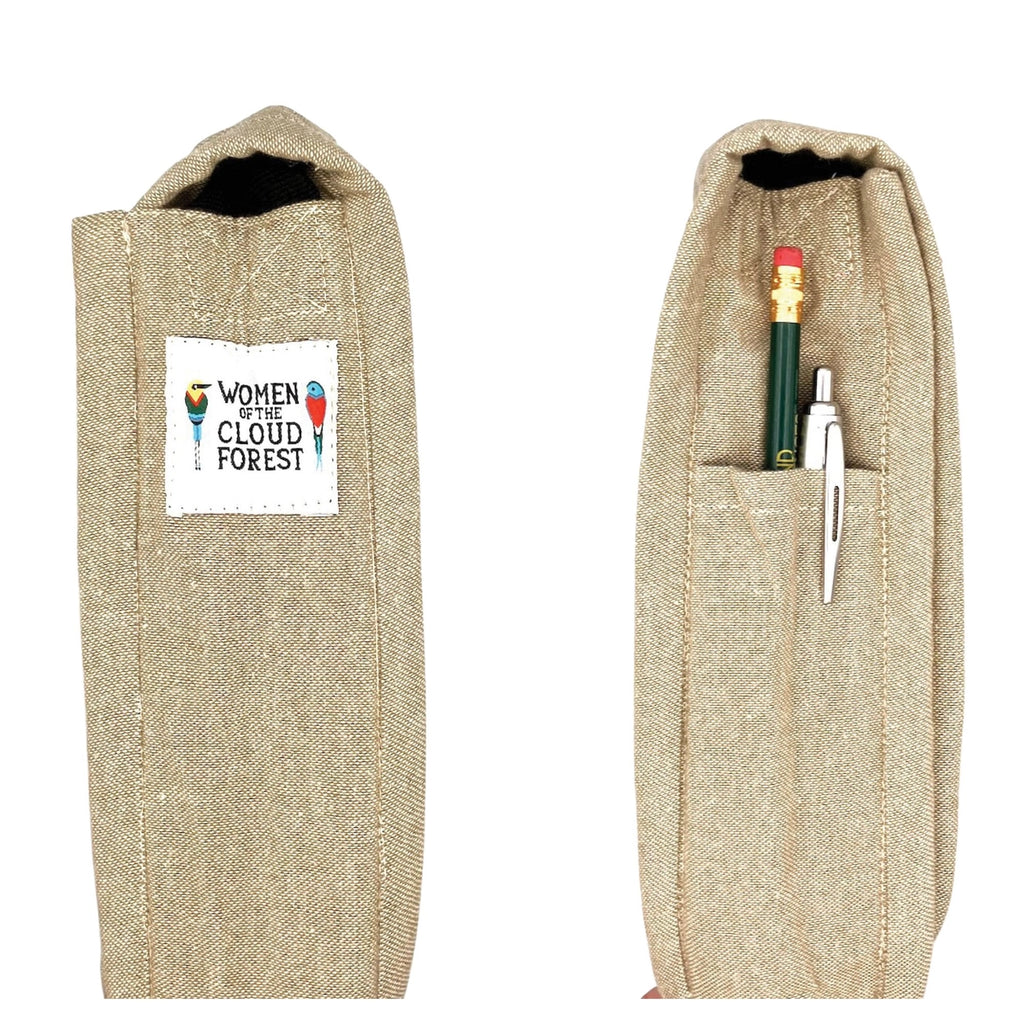 Made of 100% hand-loomed cotton, all bags have a 1.5" black nylon webbing strap (adjustable to 62"), side pen holder and back zipper pocket. Roomy enough to fit a small field guide and water bottle or a larger guide like the The Sibley Guide to Birds. The bag's interior is scoop-shaped to make it easy to quickly grab your field guide before that bird flies away.